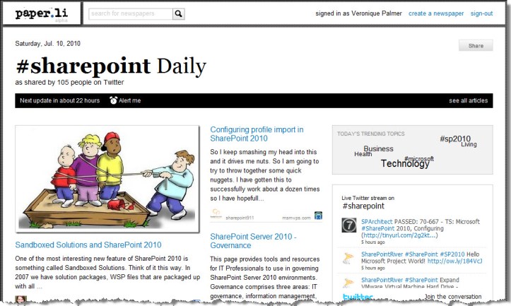 Found a pretty cool way to monitor all things SharePoint related via Twitter. A service called Paper.li. You can link it to either your Twitter (or Facebook) account and get an automated “newspaper” of the activity, (you can find the one below here) :