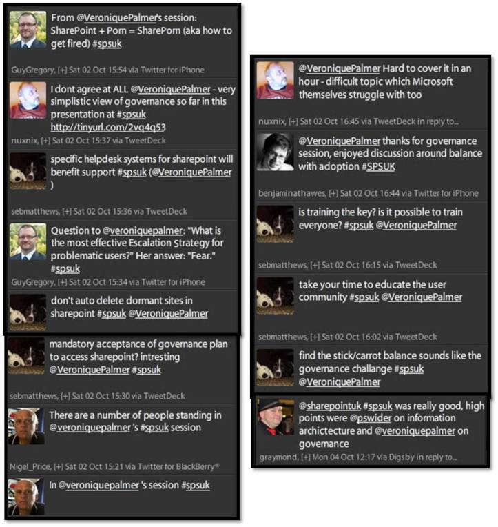 My session on SharePoint Governance and Evangelism encouraged alot of questions.  You know that thing called payback?  Ok so I got some.  Everything I said was put onto Twitter, and taken very literally.  What did I learn?  Think before you speak! Hehe.  But the feedback I got really helped. Turns out common sayings we have in SA don’t quite translate … funny that. I’ve immediately adjusted my presentation for the Singapore conference.   I’ve done some research on etiquette in Asian countries, so I’m better prepared now.  So hopefully I won’t get anymore comments about our lack of command of the English language, ouch! 😀 But thanks for the great blog anyway Ben.