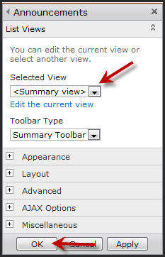 Change the Selected View to Summary View and click OK, then Save and Close your page.