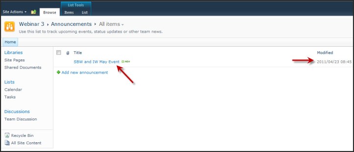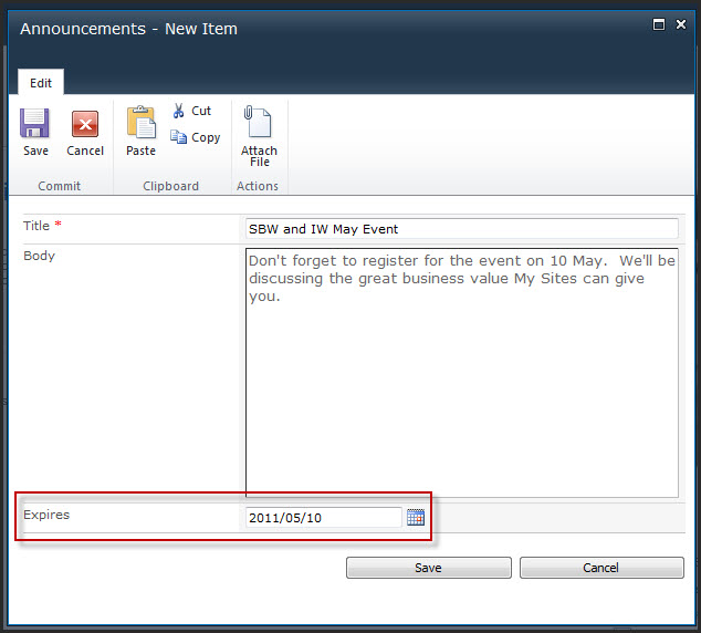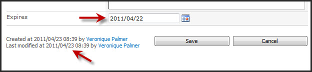 It should be part of your site governance that you always put an expiry date on your item so that when the event / news passes, the announcement no longer displays on the landing page. If you don’t put in an expiry date, you’ll have this endless list of noise all over your landing page. By putting in the expiry date, the announcement will automatically leave the landing page at midnight of that date, and be stored in the library itself instead.
