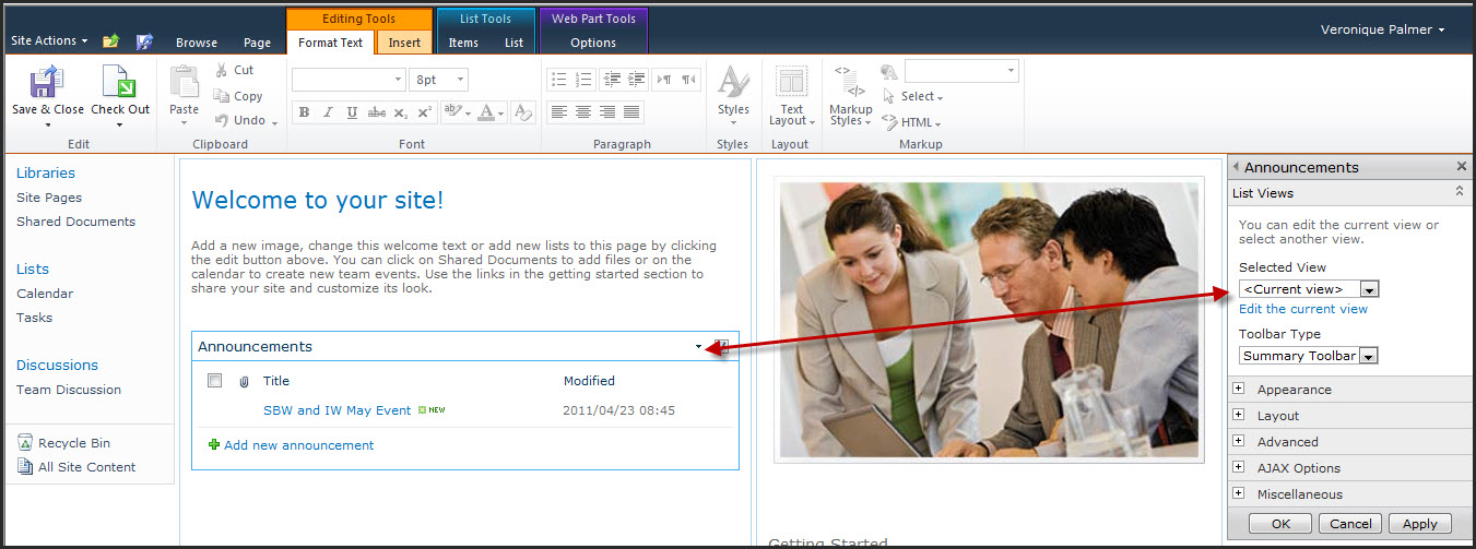 In order for the expiry date to work, you need to change the default view of the web part. (This also ties to another complaint many users have had – the announcements don’t display a summary of the article like they used to).