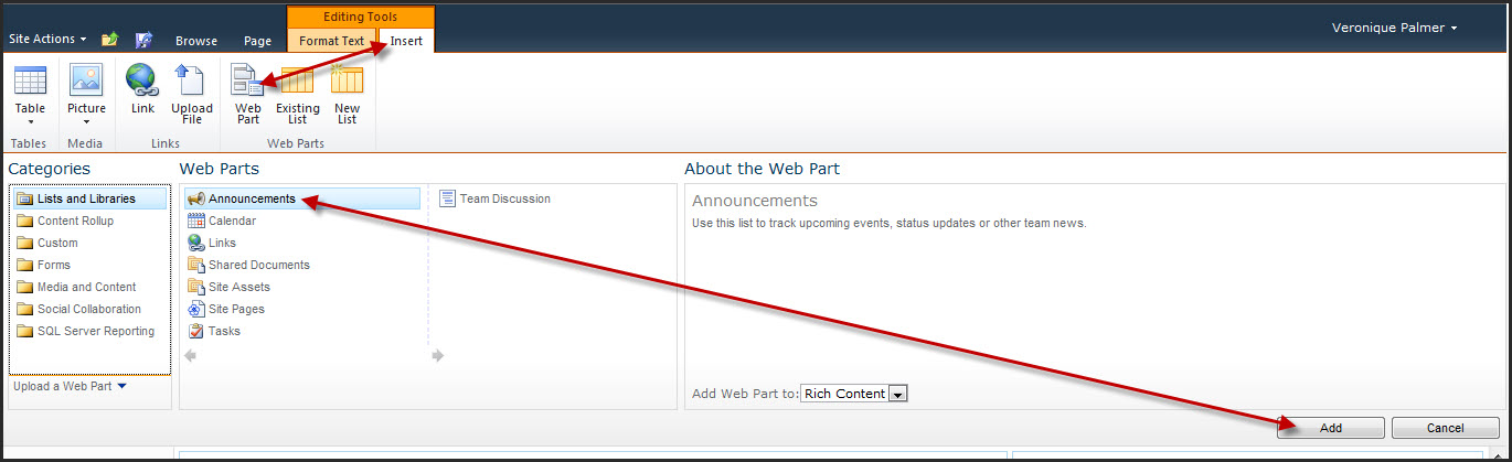 Then insert the Announcements web part into the page.