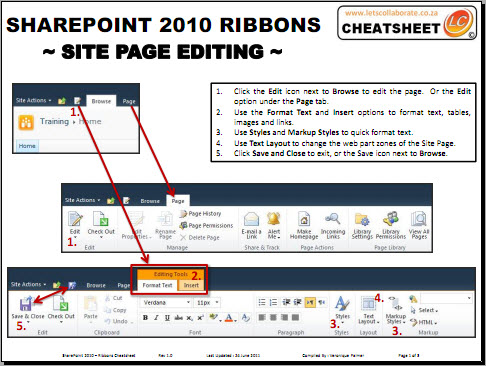Download a 3 page set of the ribbons used to manage Site Pages, Lists and Libraries.