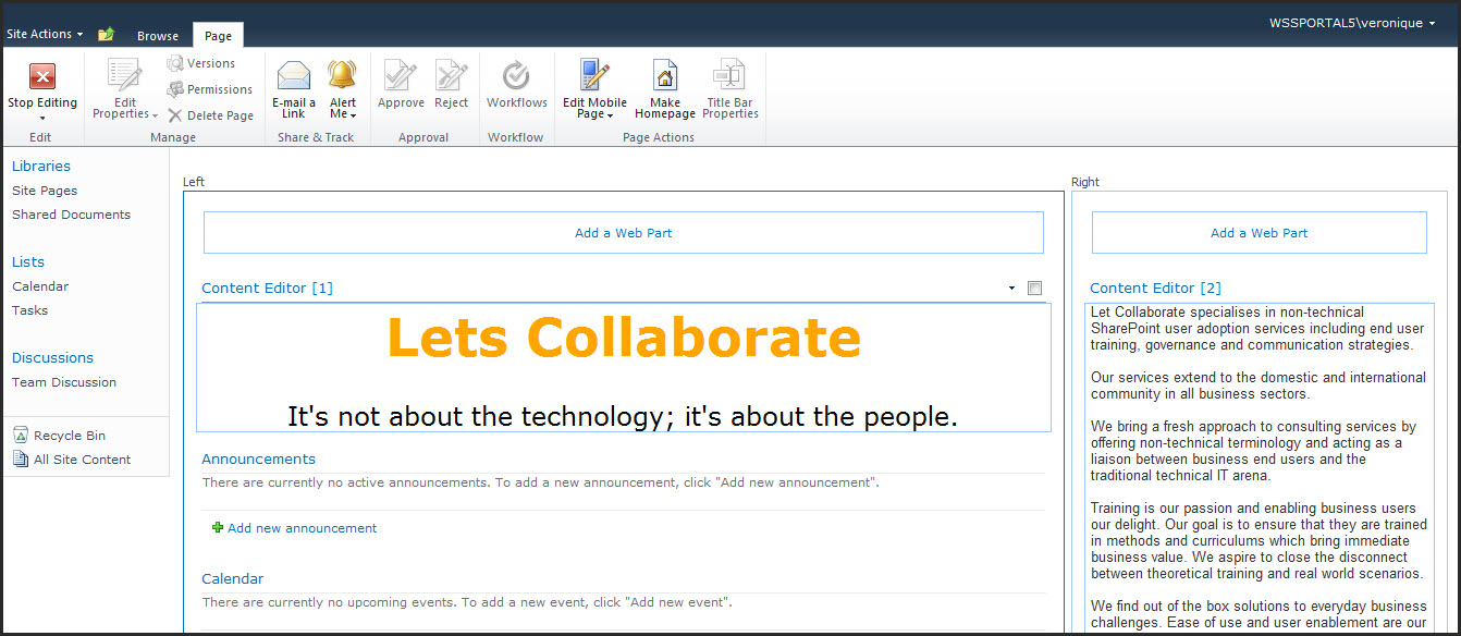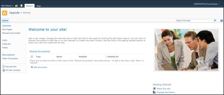 You will see the default 2010 look and feel. Just click Home twice or refresh the page if you don’t see it immediately. Notice how your entire landing page has been removed though, so it’s time to rebuild.