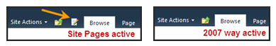 - You can see instantly if you have a 2007 or 2010 set up in SharePoint 2010. Look at the top of the ribbon. If you see an edit icon, you have 2010 site pages. If not, it’s on the 2007 way of doing things.