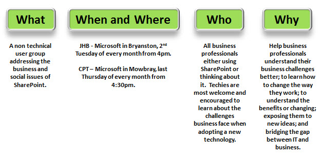 […] SharePoint Business Workshops Expands to Cape Town! #SBWCPT We are pleased to announce that SBW is expanding to Cape Town! Naz Parker from Sanlam will be the team lead down there. The format will be the same as in Jhb – the workshops are run at the same time … Continue reading → Read More… […]