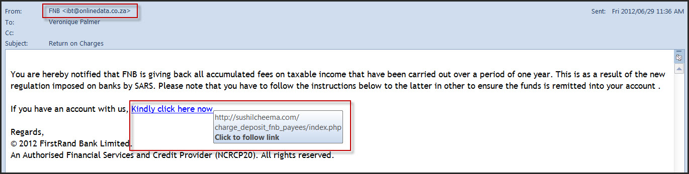 Always be careful what links you click in mails – especially when they’re from supposed banks. If you hover over the link before you click it, you will see the address. If it looks suspicious, don’t click it. Here is an example of a bank phishing email. The email address is completely fake, and the link doesn’t go anywhere near FNB’s site. Don’t be clicking things like this.