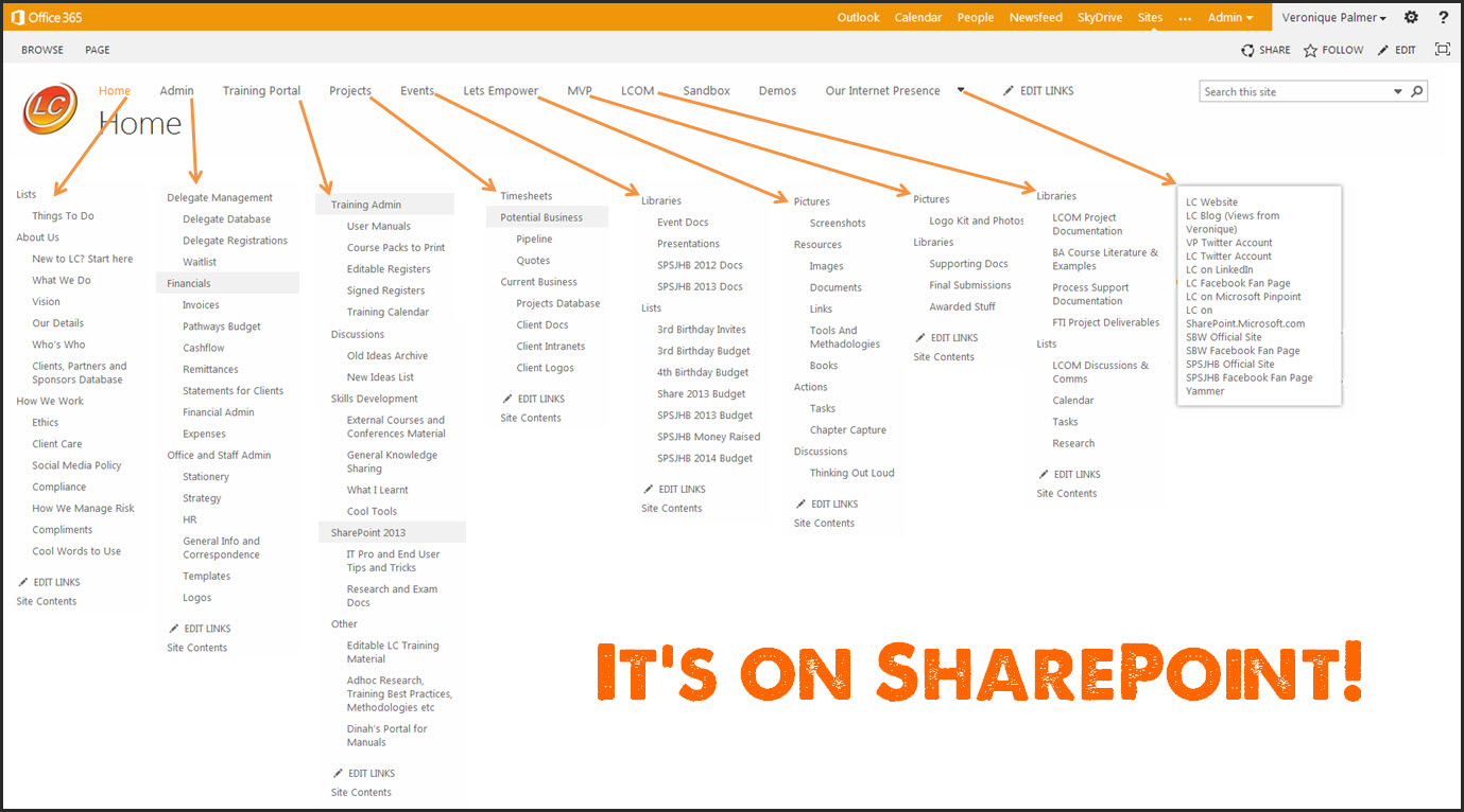 I moved us onto Office 365 because they could offer me the space I needed, remote access from anywhere, as well as Enterprise SharePoint. They also take care of all the infrastructure which saves us costs and provides sanity. We upgraded to 2013 a few months ago and this is our current intranet structure. It’s not perfect by any means but we have a lot of content on there. My entire business is managed using SharePoint. The credo is simple here; if it’s not on SharePoint, it doesn’t exist.