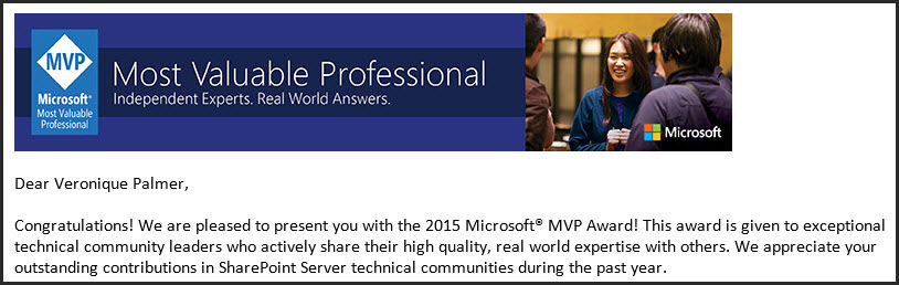January 2, 2015 Veronique Palmer Awarded SharePoint MVP for the 5th Year New Years Day has been a real pleasure the past 5 years running. 🙂 Congrats to all other renewed and new MVP’s!! May it be an epic year. Rate this:If you like this, please share this: Click to share on Facebook (Opens in new window) Facebook Click to share on X (Opens in new window) X Click to share on LinkedIn (Opens in new window) LinkedIn Click to email a link to a friend (Opens in new window) Email Click to share on WhatsApp (Opens in new window) WhatsApp Click to share on Telegram (Opens in new window) Telegram Click to share on Pinterest (Opens in new window) Pinterest Click to share on Reddit (Opens in new window) Reddit Click to share on Pocket (Opens in new window) Pocket Click to share on Tumblr (Opens in new window) Tumblr Click to print (Opens in new window) Print Like Loading... Related
