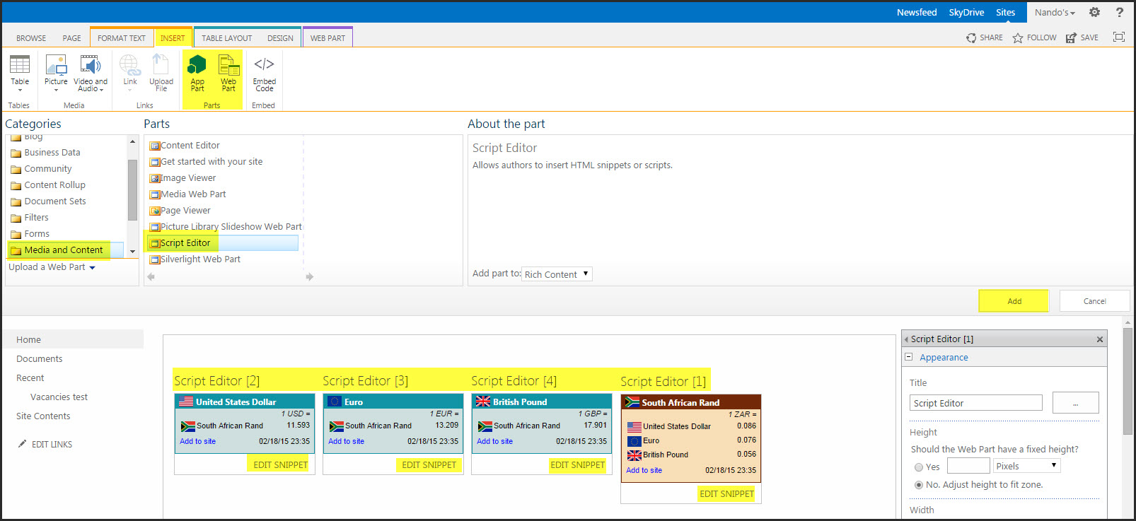 It’s common to want the Rand/Dollar etc exchange rates on intranet or team sites. After much searching to find one that works half way decently, I found Exchange Rates Widget!  It really could not be simpler :