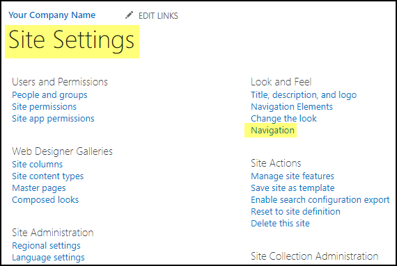 You need to have Publishing Features activated to get the option under Site Settings called Navigation. Otherwise all you will see is this.