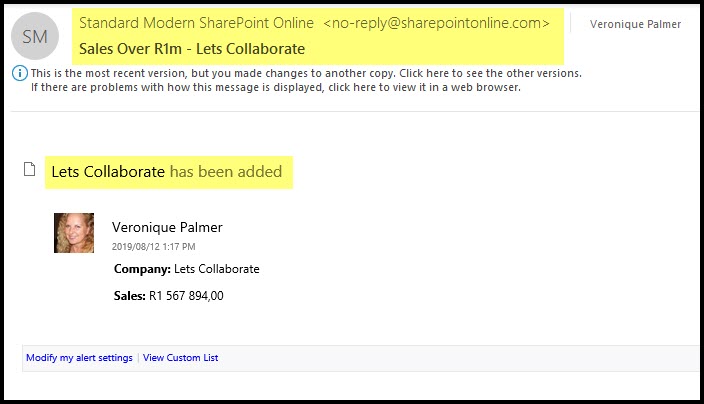 You can get an email when information in a specific column changes. For example, if you have a sales pipeline and you want to know when a sale is more than R1million, create a view with a filter to say show only items greater than or equal to R1million. Then put an alert on that view for any items that are added to it.