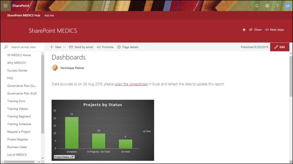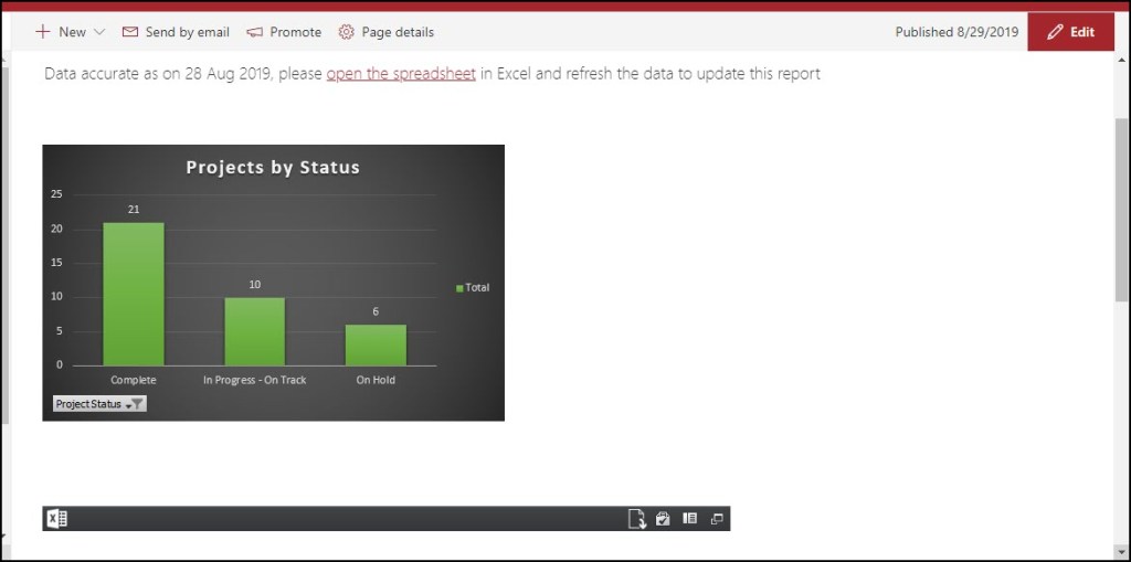 We like to add text above the charts to specify something like “Data correct as on 26 August 2019, please open the Excel spreadsheet and refresh the data”, with a link to the document that opens in another tab.