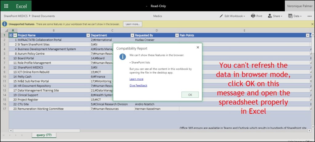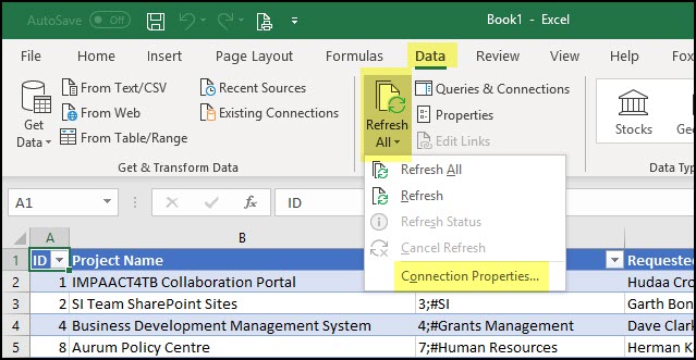 The system isn’t 100% perfect, because you will need to refresh the data on the Excel document to get the latest graphs – BUT, at least you can get cool reporting out with no code or additional licenses. You do need to open the document in Excel itself, not the browser version.
