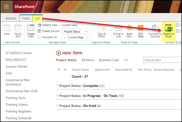 Step 5 – upload the spreadsheet to a library on the site, (we like to create a Dashboard library for this purpose if there’s a lot of lists you want to do this with).