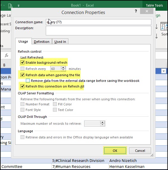 Step 3 – connect the Excel spreadsheet to the list data using these settings.