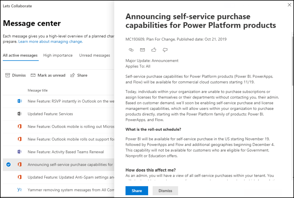Today, individuals within your organization are unable to purchase subscriptions or assign licenses for themselves or their departments without contacting you, their admin. Based on customer demand, we’ll soon be enabling self-service purchase and license management capabilities, which will allow users within your organization to purchase products directly, starting with the Power Platform family of products: Power BI, PowerApps, and Flow.