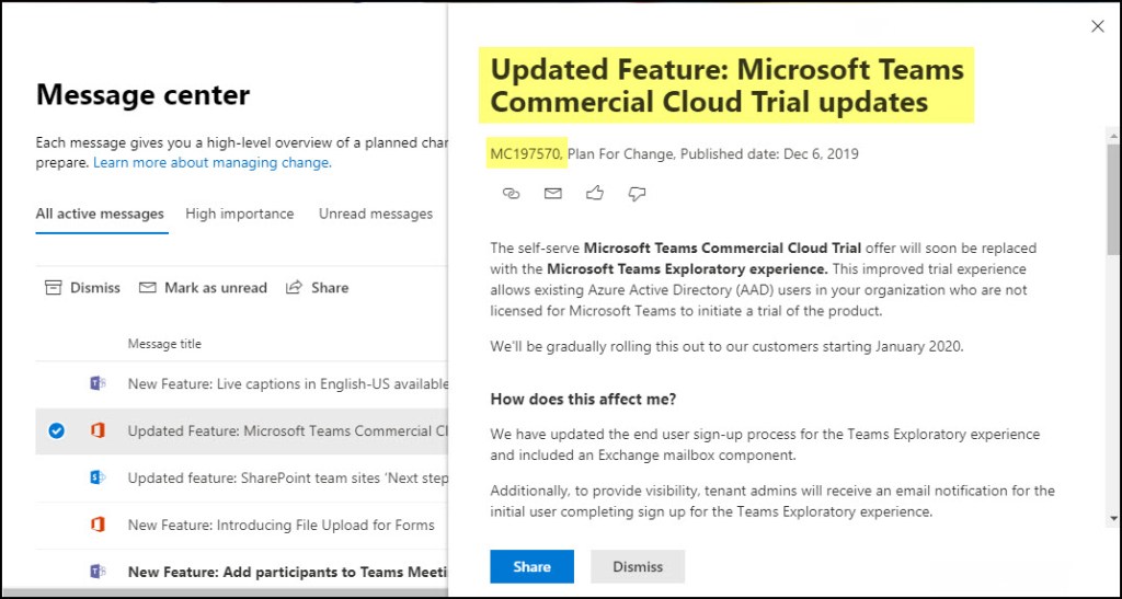 It’s message number MC197570 in the Message Centre and was called the Microsoft Teams Commercial Cloud Trial. The Microsoft Teams Commercial Cloud Trial offers existing Office 365 users in your organization who are not licensed for Microsoft Teams to initiate a 1-year trial of the product. The trial grants a one-year trial subscription to your entire organization. For each license assigned, the trial allocates 2 GB of SharePoint Online storage. Admins can switch this feature on or off for users in their organization.