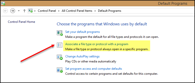 Search for Default Programs on your PC, then click on Associate a File Type or Protocol with a Program.
