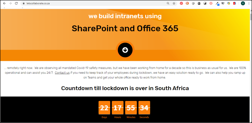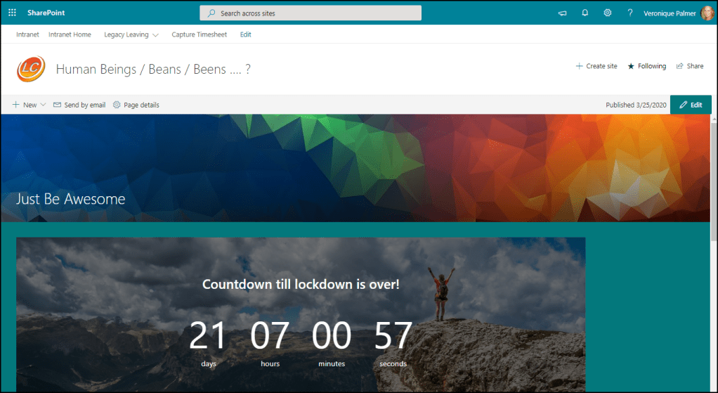 We hope you are all using SharePoint and friends to communicate the Covid-19 issues to all your staff; more on that later. For now, why not add the Countdown Timer web part to your intranet to give people something to look forward to.