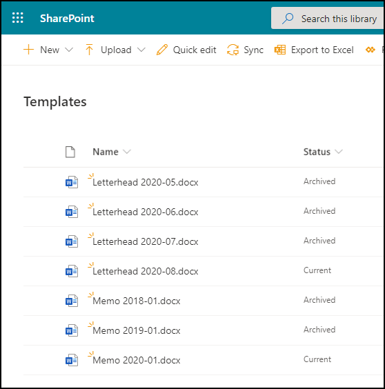 On to SharePoint. Create a templates library and make it read only access for all staff and contribute rights for those responsible for templates. Add a column for status if you need to keep old versions for auditing purposes. Don’t put this library on the Quick Launch or any other navigation.