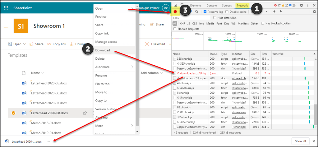 Go back to your templates library and check this cool trick. Click F12 on your keyboard to open the Developer Tools, (do not mess around in here!!!). Go to the Network tab (1) and make sure the red button is on and recording. Now click the … next to your template and “download”, (2). You’ll see it makes a red text entry in the developer tools window. Then click “Stop Recording” which you do by clicking the red button, (3).