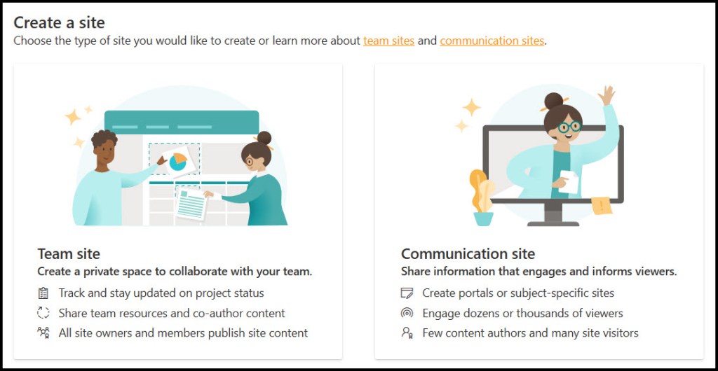 When creating sites in SharePoint Online, the default options are a Team Site (public or private); or a Communication Site template. The former is connected to a Microsoft 365 group. The latter is a stand-alone SharePoint site.