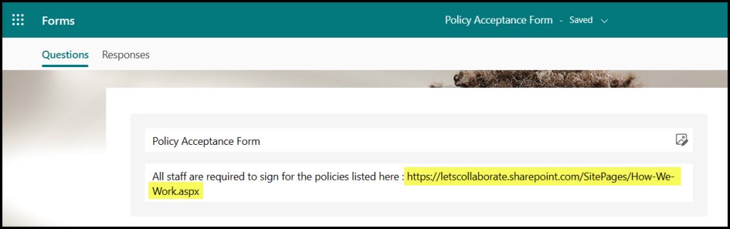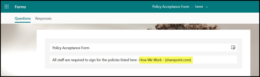 A great way to use Microsoft Forms is as a Policies Acceptance Form for staff. You can either list all the policies in the form and make people tick each one, or just put a link to where the policies live.