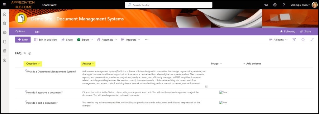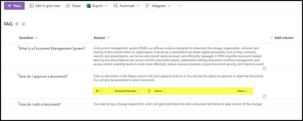Adding an image column doesn’t display the image, nor does it play well when embedding the image in the rich text answer answer field. So your options for data in the list would be a bit more limited. However, it easy to add a lot of FAQ’s quickly this was if they are only text answers.
