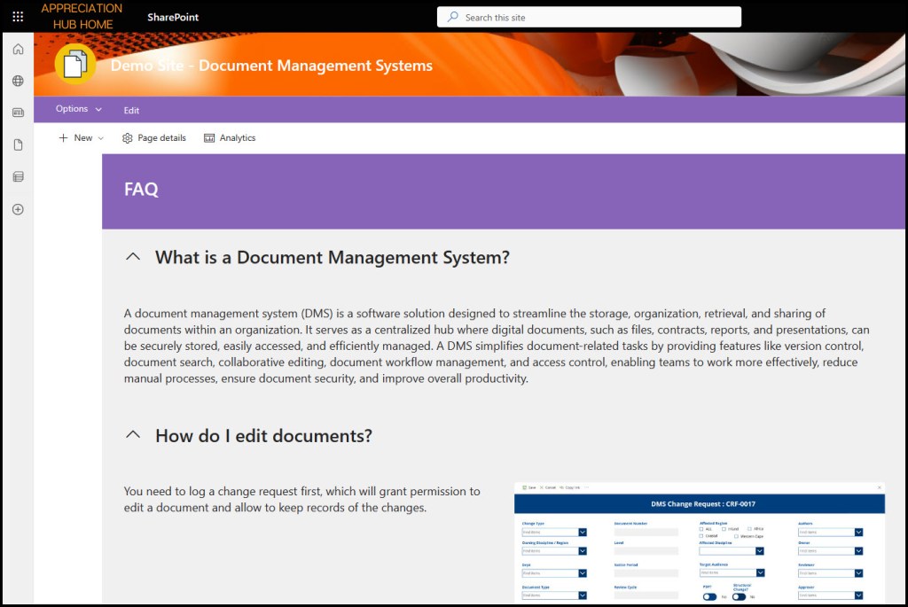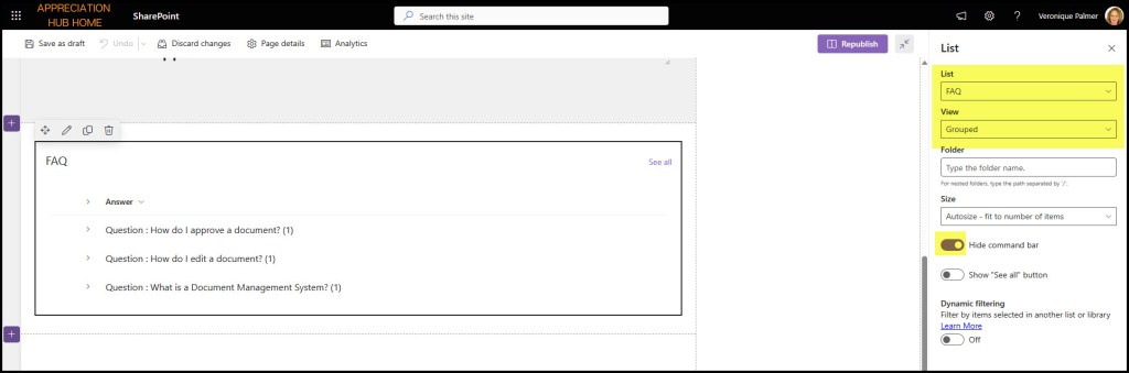 When you add a new section to the page, divide it into the applicable layout, then flip the switch on “make this section collapsible”. This will also bring up the Section Name field where you would type the question. Add the webparts to the section for the text and supporting media for the answer. Display the section as collapsed and republish your page.