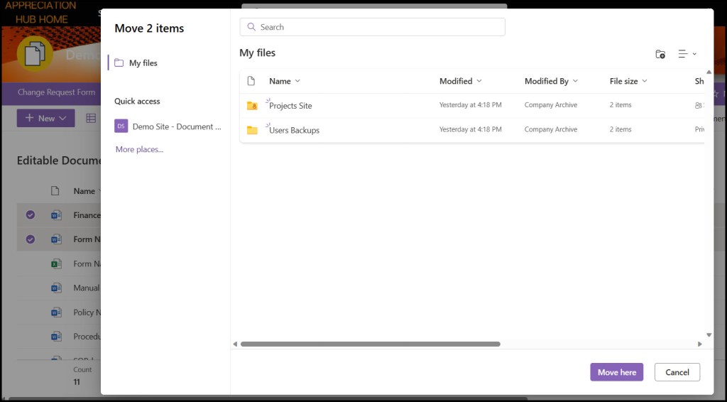 - Use the Move To function in SharePoint to move the content to the OneDrive folders. You could run PowerShell scripts if you have the knowledge and access to do so.