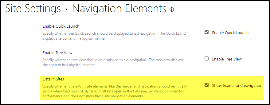 Site owners can navigate to the Navigation Elements settings page and configure a new setting called “Lists in Sites.” This setting causes navigation links to lists in that site collection to always open inside the parent SharePoint site.