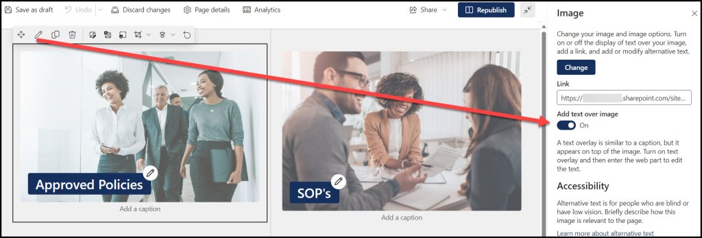 When you insert an image into a page, and switch on the option to add text over the image; you now have more editing options!