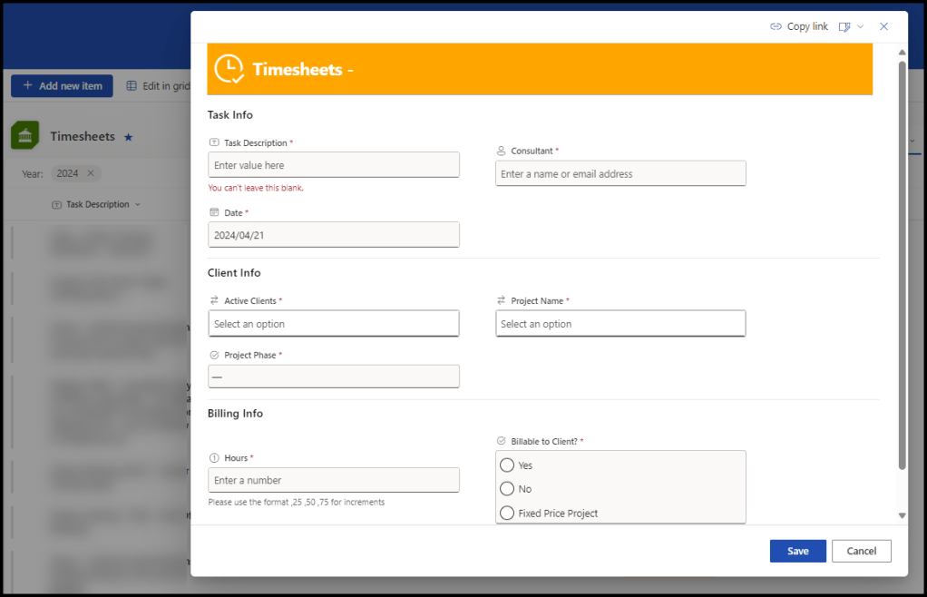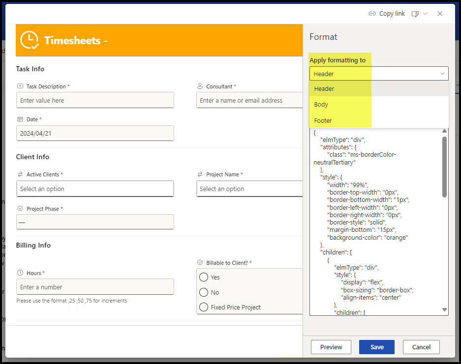 We applied some JSON to our Timesheet list. The header is orange and has an icon. The columns are next to each other. The footer used to display before Microsoft Lists took over SharePoint Lists, so now it is under the scroll bar.