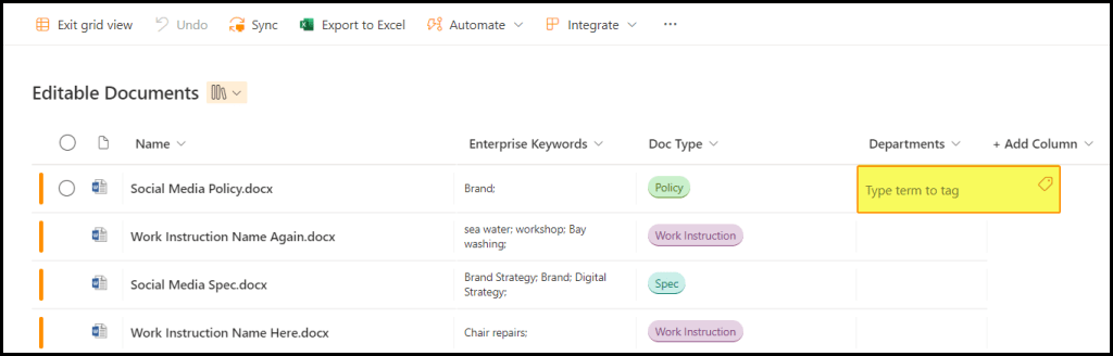 Then when using Quick Edit on list / library level, it will look like this. You can either start typing values that will populate, or click the tag to view available options.
