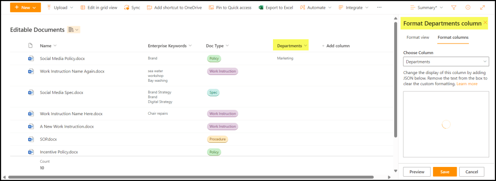 You can’t format the fields like you can with a choice field. You’d have to write a whole lot of code to make it colourful like the Doc Type column is.