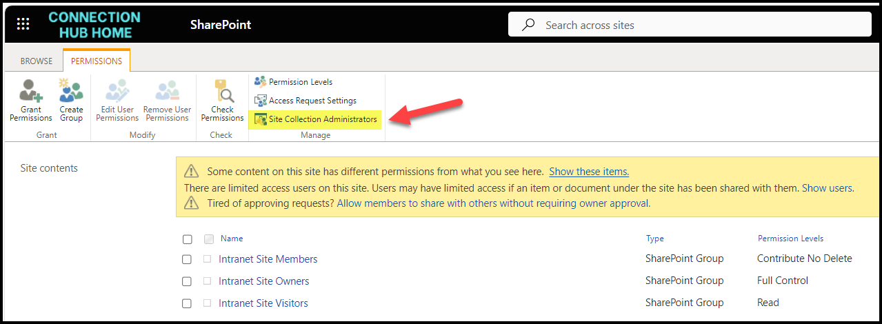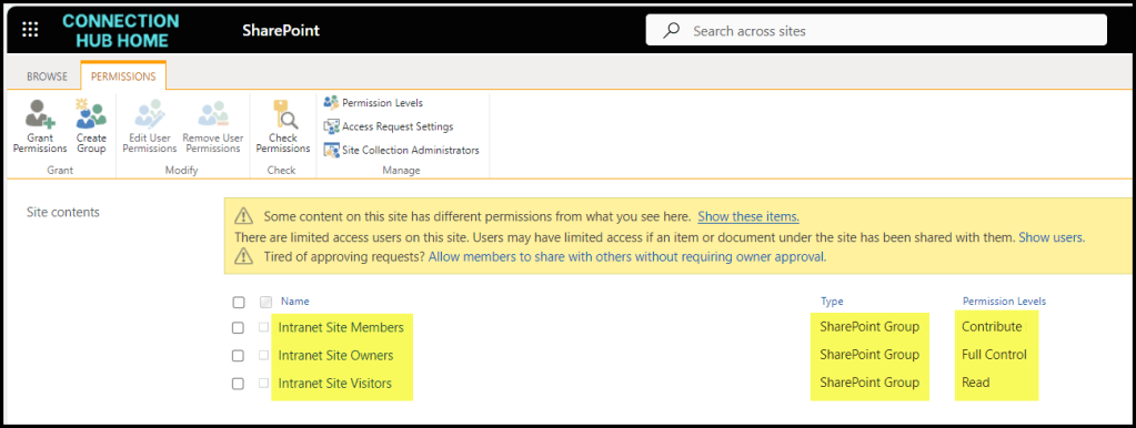 Site Members, Site Visitors, Site Owners. Read the Edit blog post for more on the Members group. Every single site collection has these 3 default SharePoint groups. You can grant permissions on site level, list/library level, folder level and document level. Although we do not advocate that on document level, it’s a mess down there.