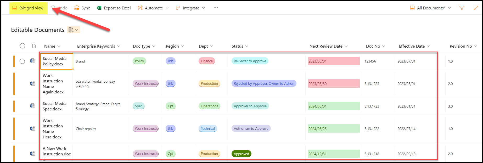 You can change any of the values in your columns, or update document names from here. If this was a list, you could also copy and paste data from Excel into the rows.