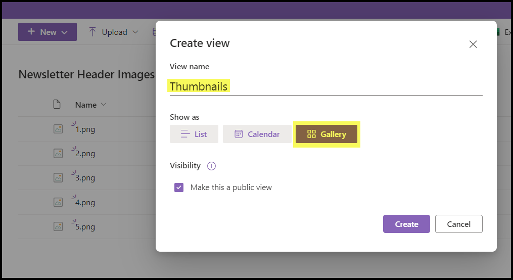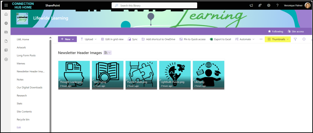 Create a ‘thumbnails’ view and make it the default to easily see the assets in SharePoint.